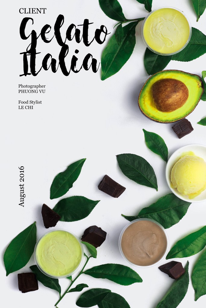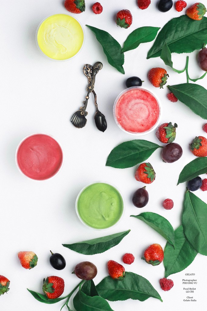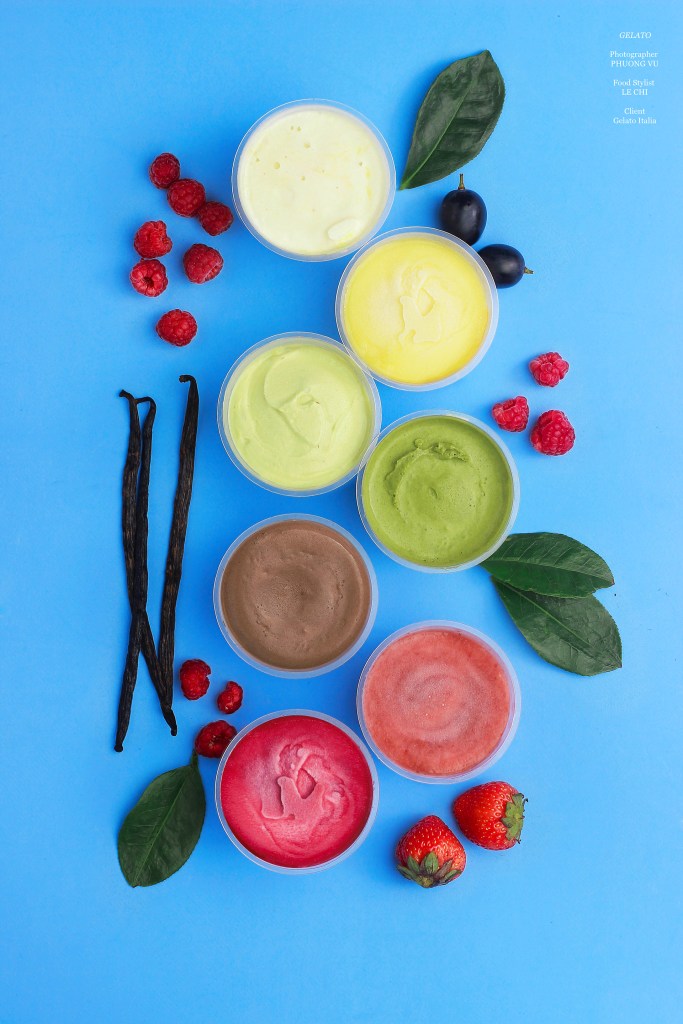 A high-end handmade ice cream shop located on To Ngoc Van street, Hanoi is an ancient white and blue mansion. The photo set uses fresh ingredients to decorate colorful ice cream boxes.